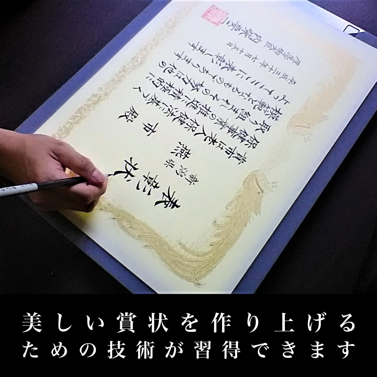 ・実践的なカリキュラム:細字の筆遣いから賞状作成の全工程を順に学習、修了時には修了証を発行