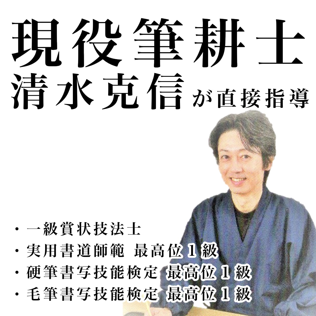書籍『賞状の書き方』(メイツ出版)監修者であり、年間300枚以上の全文賞状を揮毫する筆耕士・清水克信が、実践で役立つ技術とノウハウを丁寧に指導します。